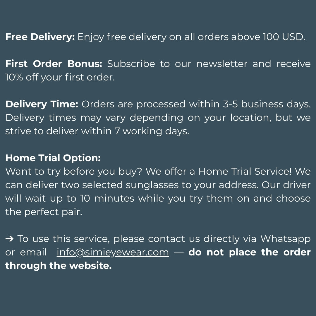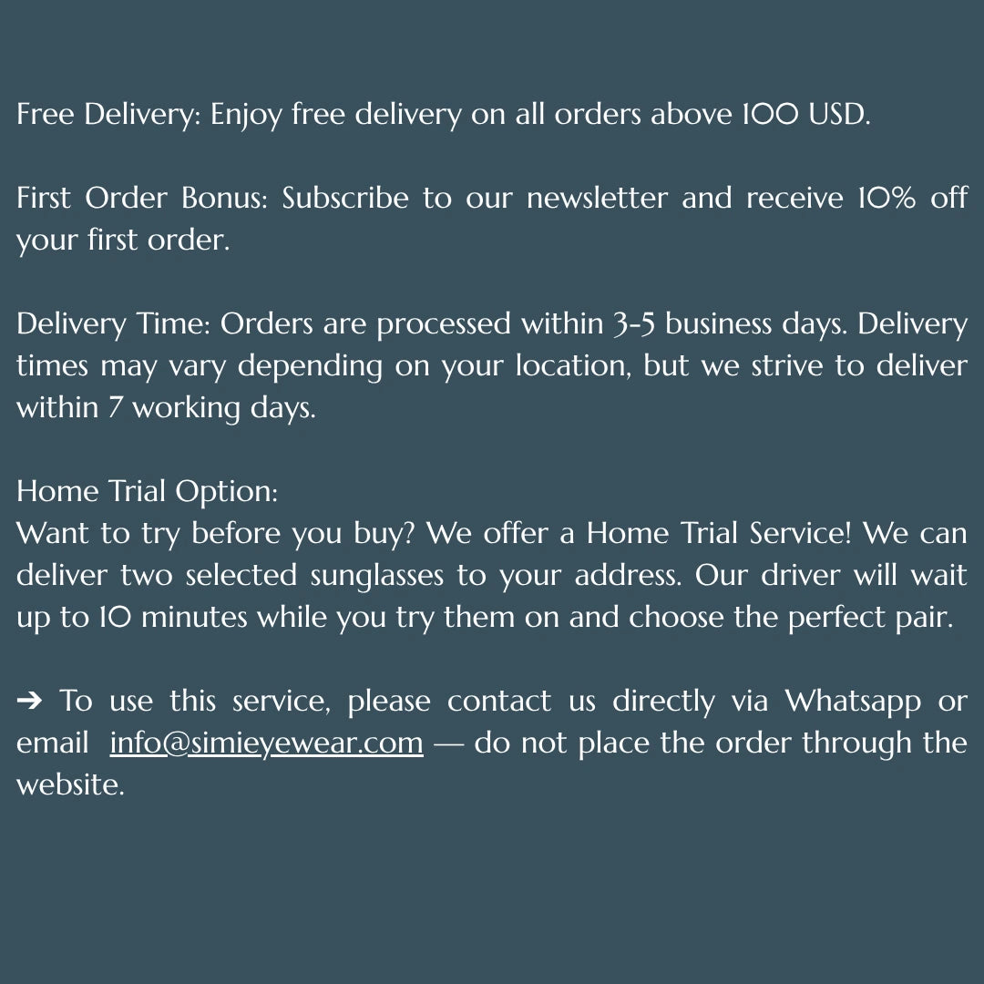 For home trial requests, please contact us directly. Do not place your order through the website. Our team will deliver up to two selected sunglasses, and the courier will wait up to 10 minutes for you to choose the pair you love. This service is subject to availability.
